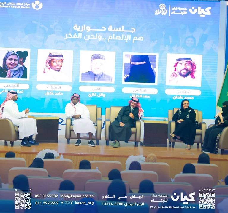 اعتلا المبدعون من أبناء وبنات كيان المتميزين خشبة المسرح وأخذوا مقاعدهم واشرأبت عيون الحاضرين والحاضرات على الشاشة التي حملت عنوان الجلسة الحوارية الرائعة التي جاءت بعنوان “هم الإلهام ونحن الفخر” وأدارها المبدع محمد عثمان وشارك فيها كل من: عهد عبد الله الطائل لتتحدث عن تجربتها في التعلم، وتهاني عبد الله الطائفي لتتحدث عن تجربتها في التطوع، ووائل غازي ليتحدث عن تجربته في التمثيل، ومحمد عثمان ليتحدث عن تجربته في الإعلام، وماجد عقيل ليتحدث عن تجربته في الابتعاث.” وذلك بحضور رئيسة مجلس الإدارة الأستاذة سمها بنت سعيد الغامدي وأعضاء مجلس الإدارة الجديد والإدارة التنفيذية وفريق العمل في جمعية كيان، وعدد من التربويين، والمختصين، والأيتام أنفسهم، وأسرهم.. وحاورهم المذيع المبدع الابن محمد عثمان.