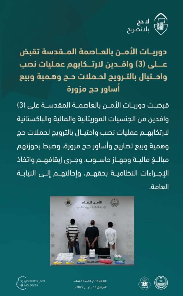 قبضت دوريات الأمن بالعاصمة المقدسة على 3 وافدين من الجنسيات الموريتانية والمالية والباكستانية؛ لارتكابهم عمليات نصب واحتيال بالترويج لحملات حج وهمية وبيع تصاريح وأساور حج مزورة، وضُبط بحوزتهم مبالغ مالية وجهاز حاسوب، وأوقفوا واتُّخذت الإجراءات النظامية بحقهم، وأحيلوا إلى النيابة العامة.