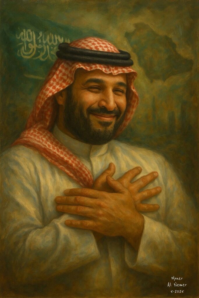 جسّد الفنان والشاعر منير النمر في عمله الفني الأخير لحظة استثنائية لصاحب السمو الملكي الأمير محمد بن سلمان بن عبدالعزيز، مستلهما ذلك من لحظة تاريخية حقيقية، إذ التُقطت ملامح اللوحة من مشهدٍ حقيقي خلال منتدى الاستثمار السعودي – الأمريكي، الذي عُقد في العاصمة الرياض بحضور عدد من أبرز قادة الاقتصاد والتقنية في العالم، منهم إيلون ماسك.
