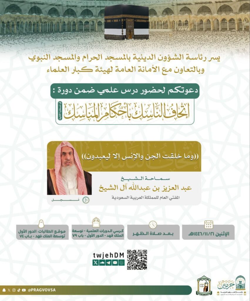 وكان سماحة المفتي العام للمملكة رئيس هيئة كبار العلماء الرئيس العام للبحوث العلمية والإفتاء الشيخ عبدالعزيز بن عبدالله بن محمد آل الشيخ قد افتتح الدورة العلمية الكبرى «إتحاف الناسك بأحكام المناسك» في المسجد الحرام، التي أطلقتها رئاسة الشؤون الدينية بالمسجد الحرام والمسجد النبوي بالتعاون مع الأمانة العامة لهيئة كبار العلماء خلال الفترة من 19 ذي القعدة إلى 5 ذي الحجة 1446هـ.