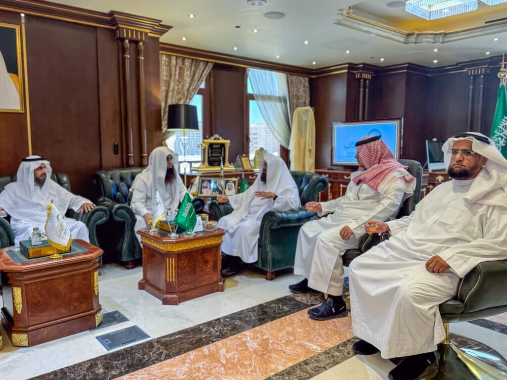 أستقبل معالي رئيس الشؤون الدينية بالمسجد الحرام والمسجد النبوي الشيخ الأستاذ الدكتور عبدالرحمن بن عبدالعزيز السديس بمكتبه برئاسة الشؤون الدينية بالمسجد النبوي فضيلة الشيخ الدكتور محمد بن أحمد الخضيري مساعد رئيس الشؤون الدينية بالمسجد النبوي، وفضيلة الشيخ عبدالله بن حطاب الحنيني الوكيل المساعد للشؤون الدينية بالمسجد النبوي، وأصحاب الفضيلة والسعادة مستشاري رئاسة الشؤون الدينية بالمسجد النبوي.