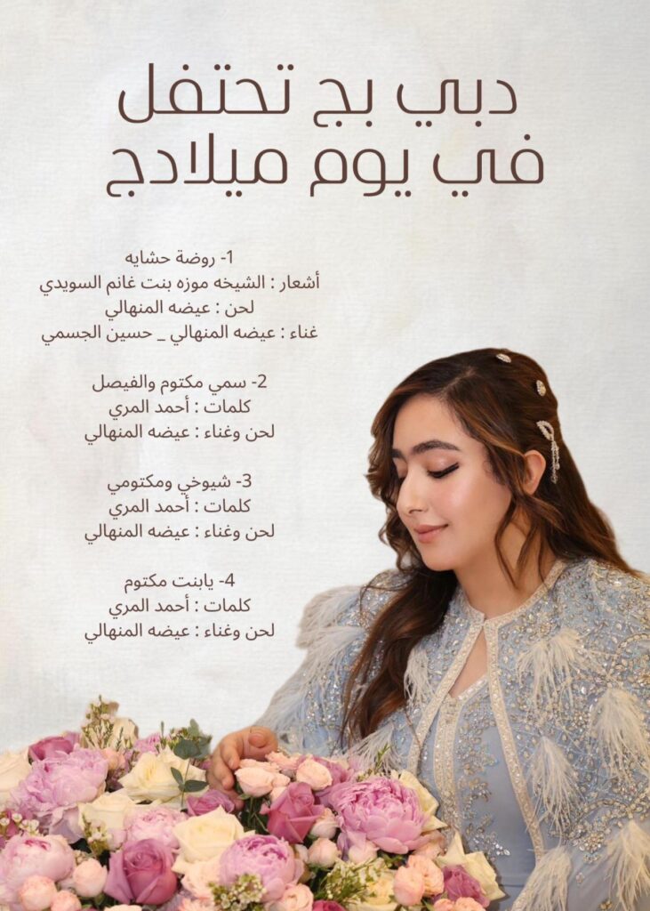 وقد حملت الأغاني الأربعة رسالة تهنئة نابعة من القلب، صيغت باللهجة الإماراتية في عبارة محبّة وردت في مقدمة الأعمال: “دبي بج تحتفل في يوم ميلادج”، تعبيراً عن مكانة الشيخة في القلوب، وتقديراً لعطائها وإنسانيتها.