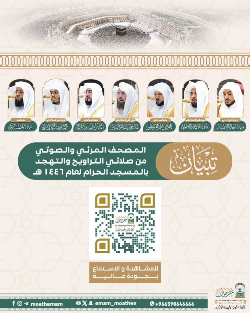 وأوضح معاليه :أن المصحف المرئي والصوتي يُوثّق تلاوات صلاتي التراويح والتهجد التي أُقيمت خلال الشهر الكريم، ويضم نخبة من التلاوات المباركة لأصحاب المعالي والفضيلة أئمة المسجد الحرام، مضيفًا أن هذه المبادرة تأتي في إطار جهود الرئاسة في توثيق ونشر التلاوات المباركة وتيسير الوصول إليها عبر الوسائط التقنية الحديثة، بما يعزز من الأثر الإيماني والروحي لها.