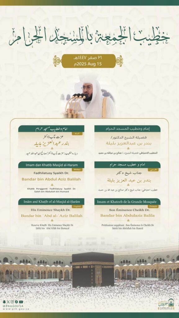 وسيتولى فضيلة الشيخ الدكتور بندر بليلة المصلين وإلقاء خطبة الجمعة في المسجد الحرام.