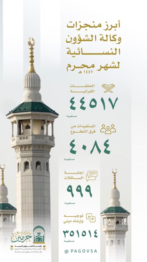 نفذت الوكالة المساعدة للشؤون النسائية برئاسة الشؤون الدينية بالمسجد الحرام والمسجد النبوي، خلال شهر محرم، حزمة من البرامج القرآنية والتطوعية والإرشادية، شملت برامج إثرائية ومبادرات نوعية ضمن الخطة التشغيلية لموسم العمرة الحالي، واستفادت منها أعداد كبيرة من القاصدات والزائرات.