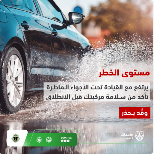 شددت الإدارة العامة للمرور في المملكة العربية السعودية على ضرورة اتخاذ إجراءات السلامة قبل القيادة في الأجواء الممطرة. ونشرت الإدارة على حسابها الرسمي في منصة “إكس” (X) إنفوجراف توضيحي جاء فيه: “مستوى الخطر يرتفع مع القيادة تحت الأجواء الماطرة. تأكد من سلامة مركبتك قبل الانطلاق وقُد بحذر”.