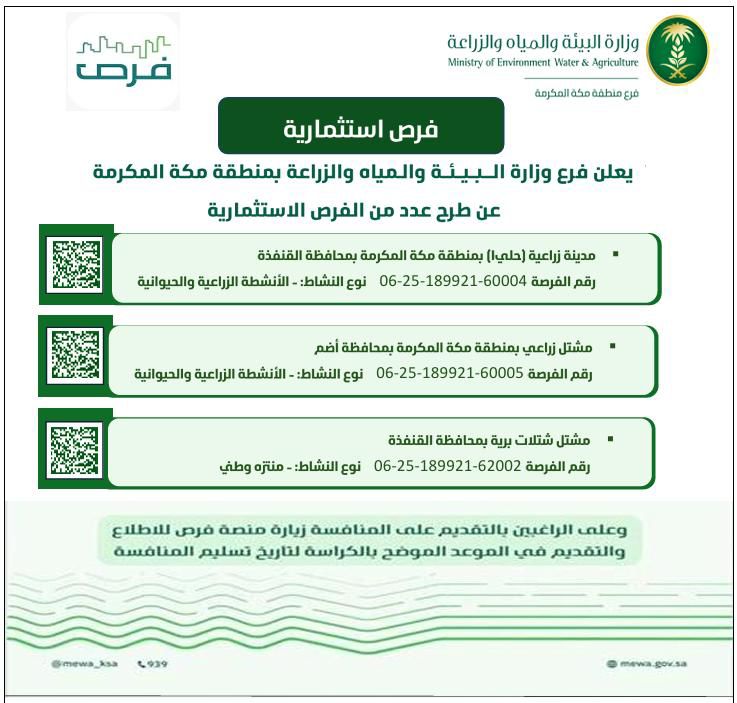 أو فرع وزارة البيئة والمياه والزراعة بمنطقة مكة المكرمة عن طرح عدد من الفرص الاستثمارية المتنوعة في محافظات المنطقة، تتضمن الفرص المطروحة مشاريع في مجال الثروة الزراعية، وذلك في إطار تعزيز الشراكة مع القطاع الخاص ودعم التنمية الريفية والزراعية المستدامة.