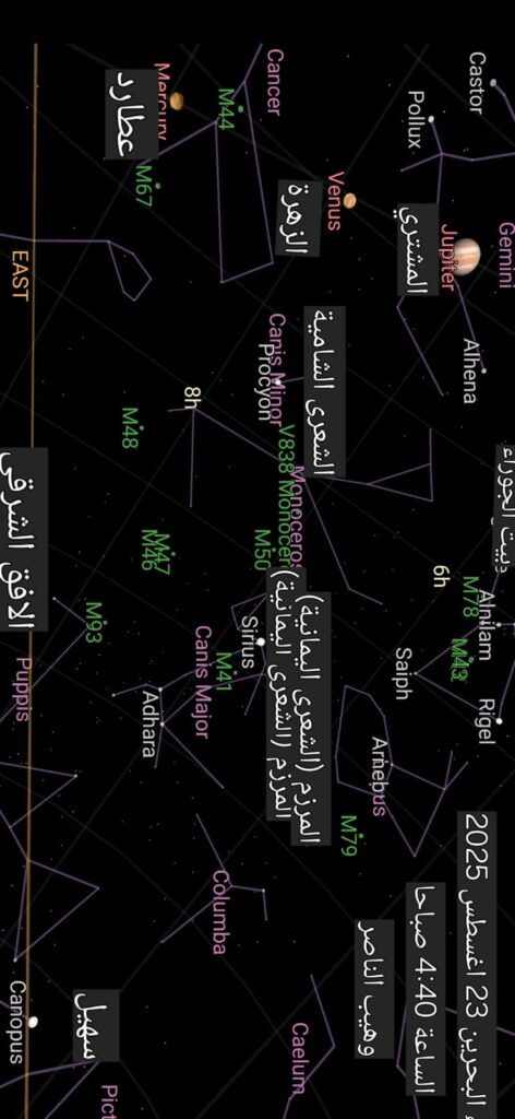 ويظهر في خارطة محاكاة سماء البحرين ( ولا تختلف عنها دول الخليج العربي) الكواكب *المشتري و الزهرة وعطارد على خط راسي*، و يجاورهم برج الجوزاء ( المقدم والاخر) واسفل منه برج السرطان.