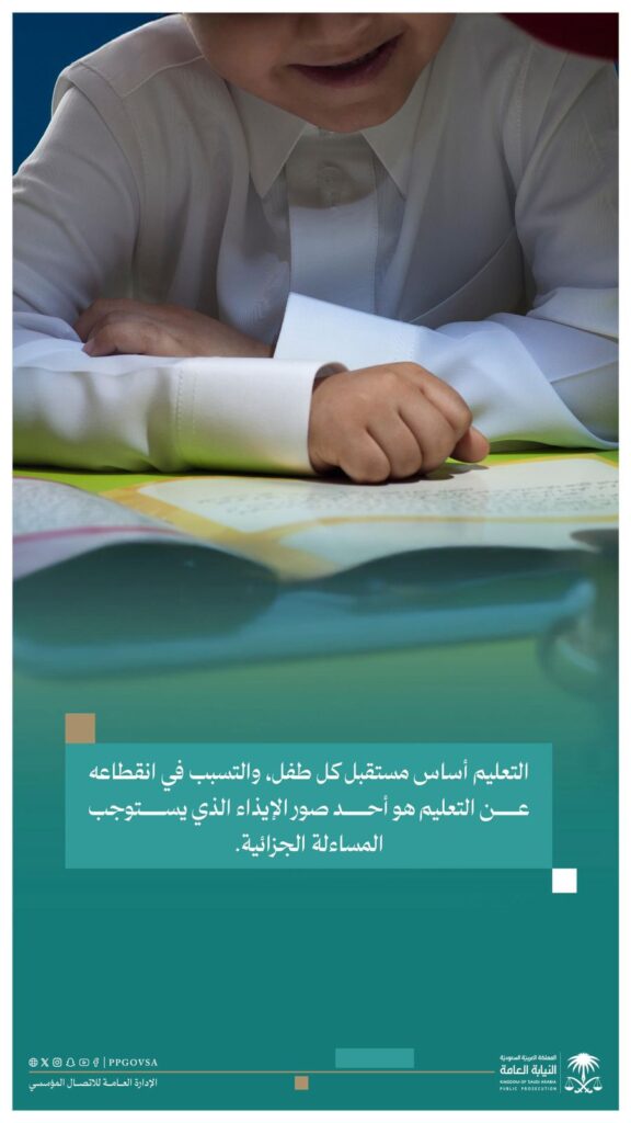 شدّدت النيابة العامة، عبر حسابها الرسمي في منصة “X”، على أن التعليم يُشكّل حقاً أساسياً لكل طفل، والتسبّب في حرمانه منه يُعد من صور الإيذاء الموجب للمساءلة الجزائية وفقاً لأحكام نظام حماية الطفل.
