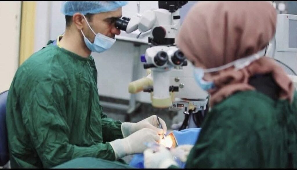 تمت العملية تحت التخدير الموضعي واستغرقت حوالي ساعتين. وشملت الإجراءات الطبية قص السائل الزجاجي الخلفي، وترميم القرنية، وإزالة الماء الأبيض، وزرع عدسة. وقد تكللت العملية بالنجاح التام بفضل جهود الفريق الطبي المتخصص والكوادر المساندة.
