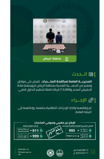 قبضت المديرية العامة لمكافحة المخدرات على مواطن ومقيم من الجنسية الهندية بمنطقة الرياض لترويجهما مادة الحشيش المخدر و (13,069) قرصًا خاضعًا لتنظيم التداول الطبي، وجرى إيقافهما واتخاذ الإجراءات النظامية بحقهما، وإحالتهما إلى النيابة العامة.