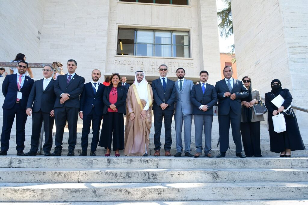 واستُهل الحفل بكلمة ألقاها سعادة الأمين العام للمجمع، الأستاذ الدكتور/ عبدالله بن صالح الوشمي، أشار فيها إلى أن المجمع يتشرف بما يجده في عموم برامجه وأعماله من الدعم الدائم من سمو وزير الثقافة، رئيس مجلس أمناء المجمع، صاحب السمو الأمير/ بدر بن عبدالله بن فرحان آل سعود -حفظه الله- مثمنًا دعم سفارة خادم الحرمين الشريفين في جمهورية إيطاليا، وتأييدها لأعمال المجمع ونشاطاته.
