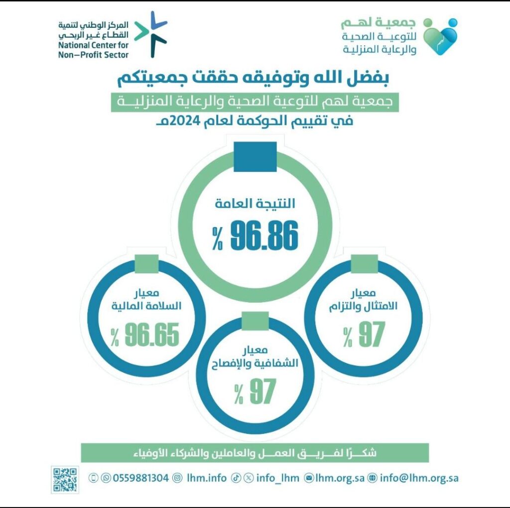 في تأكيد على التزامها المطلق بالشفافية والمسؤولية المؤسسية، أعلنت جمعية “لهم” للتوعية الصحية والرعاية المنزلية عن حصولها على نسبة مذهلة بلغت 96.86% في تقييم معايير الحوكمة للعام 2024. هذا الإنجاز يعكس إيمان الجمعية بأن الأثر الحقيقي ينبع من جوهر عملها القائم على النزاهة والالتزام تجاه المجتمع والفرد.