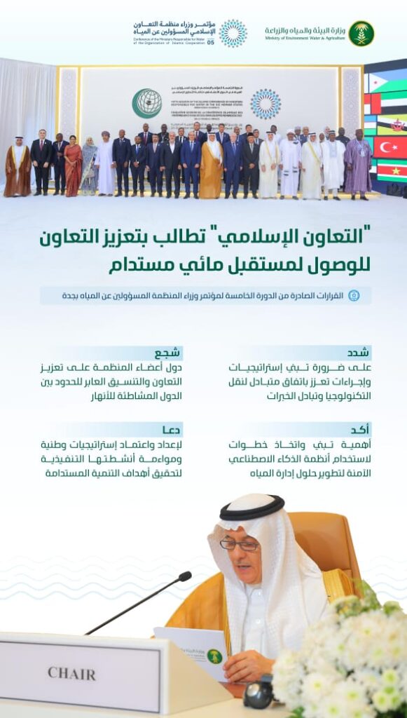 جاء ذلك خلال ختام أعمال الدورة الخامسة للمؤتمر الإسلامي للوزراء المسؤولين عن المياه في الدول الأعضاء في المنظمة، والتي استمرت لمدة ثلاثة أيام (20- 22 أكتوبر 2025) اختتمت اليوم في محافظة جدة تحت شعار “من الرؤية إلى التأثير”، بمشاركة وزراء ومندوبين من الدول الأعضاء ورؤساء وممثلي المؤسسات التابعة للمنظمة ذات الصلة، حيث ناقش المشاركون سبل تطوير التعاون في مجال المياه وتعزيز الأمن المائي في العالم الإسلامي.