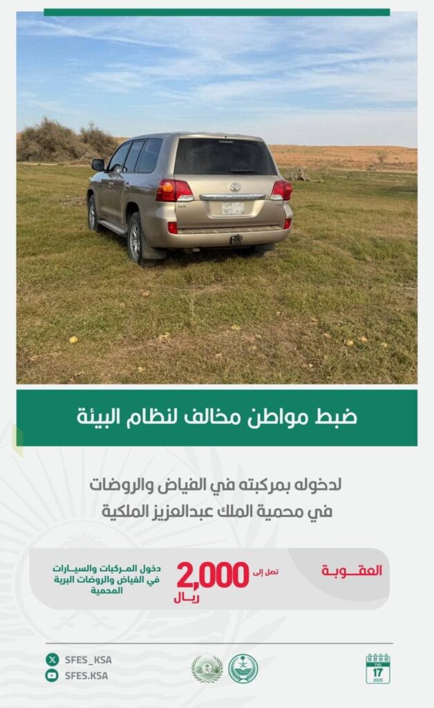 ضبطت القوات الخاصة للأمن البيئي مواطنًا مخالفًا لنظام البيئة لدخوله بمركبته في الفياض والروضات في محمية الملك عبدالعزيز الملكية بمنطقة الرياض، وتم تطبيق الإجراءات النظامية بحقه.وأوضحت القوات أن عقوبة دخول المركبات والسيارات في الفياض والروضات البرية المحمية تصل إلى (2,000) ريال، حاثةً على الإبلاغ عن أي حالات تمثل اعتداءً على البيئة أو الحياة الفطرية على الرقم (911) بمناطق مكة المكرمة والرياض والشرقية، و(999) و(996) في بقية مناطق المملكة.
