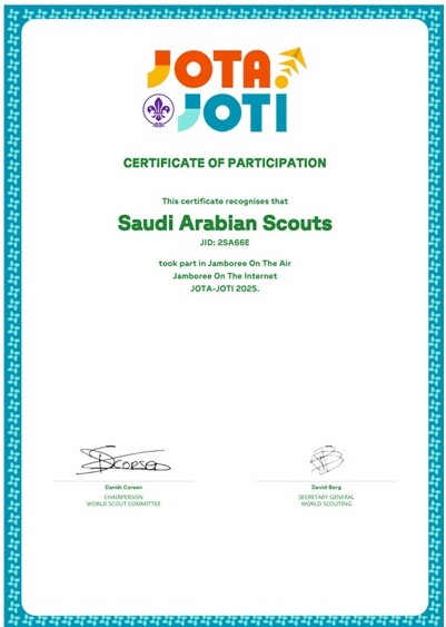 تلقت جمعية الكشافة العربية السعودية شهادة مشاركة رسمية من المنظمة الكشفية العالمية تقديراً لمشاركتها الفاعلة في فعاليتي الجامبوري على الهواء (Jamboree On The Air) والجامبوري على الإنترنت (Jamboree On The Internet) ضمن برنامج جوتا – جوتي 2025 (JOTA–JOTI 2025)، والذي أقيم هذا العام تحت شعار “عالم يصنعه الشباب” .