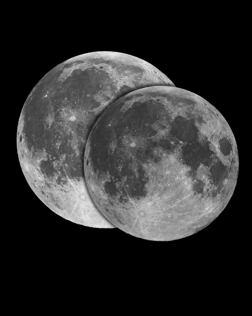 الصورة المرفقة: مقارنة بين الحجم الظاهري للقمر العملاق (عند الحضيض) – إلى اليسار – حيث يبدو أكبر بنحو 14٪ وأكثر سطوعاً بنحو 30٪ من القمر عند الأوج.