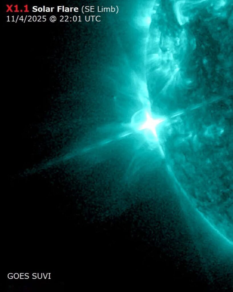 أوضح ذلك المهندس ماجد ابوزاهرة شهدت الشمس ارتفاعاً ملحوظاً في نشاطها بعد رصد ثاني توهج شمسي من الفئة X خلال اليوم نفسه (04 نوفمبر 2025( بلغت قوته X1.1 وقد تم إكتشاف هذا الإنفجار بالقرب من منطقة شمسية جديدة لا تزال خارج الطرف الجنوبي الشرقي لقرص الشمس ما يعني أنها لم تدخل بعد في مجال الرصد المباشر من الأرض.