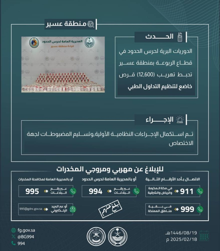 أحبطت الدوريات البرية لحرس الحدود في قطاع الربوعة بمنطقة عسير تهريب (12,600) قرصٍ خاضعٍ لتنظيم التداول الطبي، وجرى استكمال الإجراءات النظامية الأولية, وتسليم المضبوطات لجهة الاختصاص.وتهيب الجهات الأمنية بالإبلاغ عن كل ما يتوافر من معلومات لدى المواطنين والمقيمين عن أي نشاطات ذات صلة بتهريب أو ترويج المخدرات، وذلك من خلال الاتصال بالأرقام (911) في مناطق مكة المكرمة والرياض والشرقية و(999) في بقية مناطق المملكة، ورقم بلاغات المديرية العامة لمكافحة المخدرات (995)، وعبر البريد الإلكتروني (mail:995@gdnc.gov.sa)، وستعالج جميع البلاغات بسرية تامة.