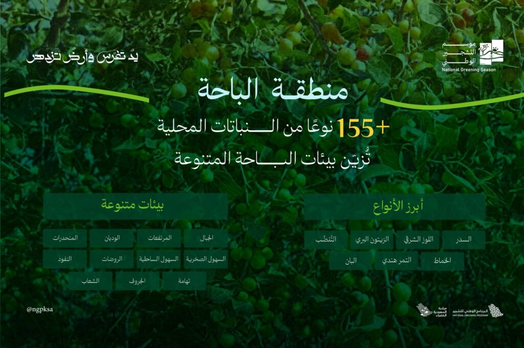 وأكد البرنامج الوطني للتشجير، أن البيئات المتنوعة في منطقة الباحة، تلائم نحو 155 نوعًا من النباتات المحلية، التي تنتشر بشكلٍ متفاوت في مرتفعاتها، ووديانها، وجبالها، ومنحدراتها، وسهولها الصخرية، بالإضافة إلى الروضات، والنفود، والسهول الساحلية، وغيرها من البيئات، مشيرًا إلى أن هذا التنوع الطبيعي البيئي، أسهم في تعزيز مشاريع التشجير في في جميع مناطق المملكة، دعمًا لجهود الحفاظ على البيئة، تماشيًا مع مستهدفات رؤية السعودية 2030.
