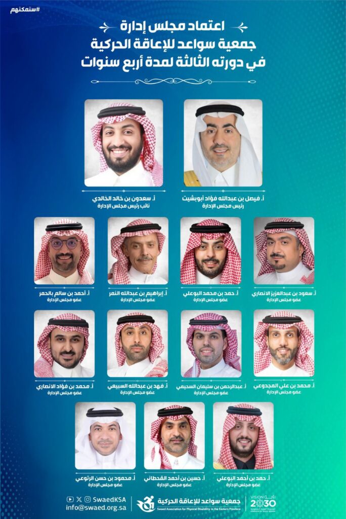أعلنـت جمعية سواعد للإعاقة الحركية بالمنطقة الشرقية عن صدور موافقة المركز الوطني لتنمية القطاع غير الربحي على اعتماد التشكيل الجديد لمجلس إدارة الجمعية في دورته الثالثة ، وذلك اعتبارًا من تاريخ 11 ديسمبر 2025م، ولمدة أربع سنوات تنتهي في 23 ديسمبر 2029م.