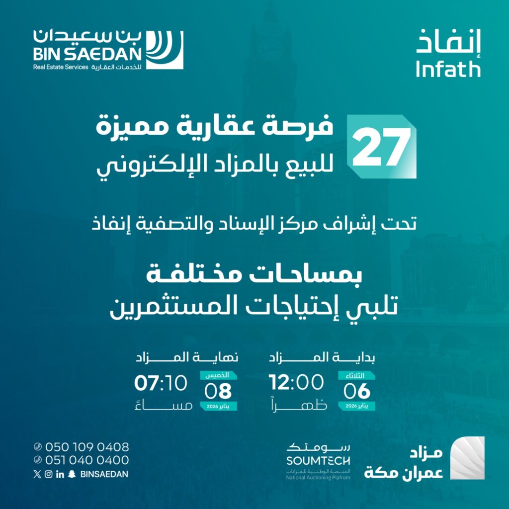 تعلن شركة بن سعيدان للخدمات العقارية وتحت إشراف مركز الإسناد والتصفية ” إنفاذ ” وبقرار من محكمة التنفيذ ، عن إقامة مزاد ” عمران مكة ” إلكترونيا على منصة سومتك للمزادات وذلك يوم الثلاثاء 2026/01/06 .