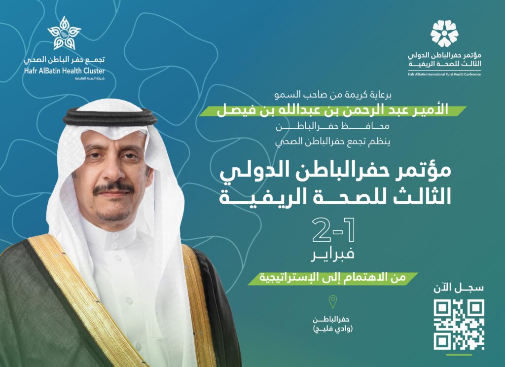 برعاية وتشريف سمو محافظ حفر الباطن صاحب السمو الأمير عبد الرحمن بن عبدالله بن فيصل، ينظم تجمع حفر الباطن الصحي خلال يومي 1–2 فبراير 2026م مؤتمر حفر الباطن الدولي للصحة الريفية في نسخته الثالثة، تحت شعار “من الإهتمام الى الاستراتيجية”، بمشاركة عدد من الجهات المحلية والدولية المهتمة بقطاع الصحة الريفية.
