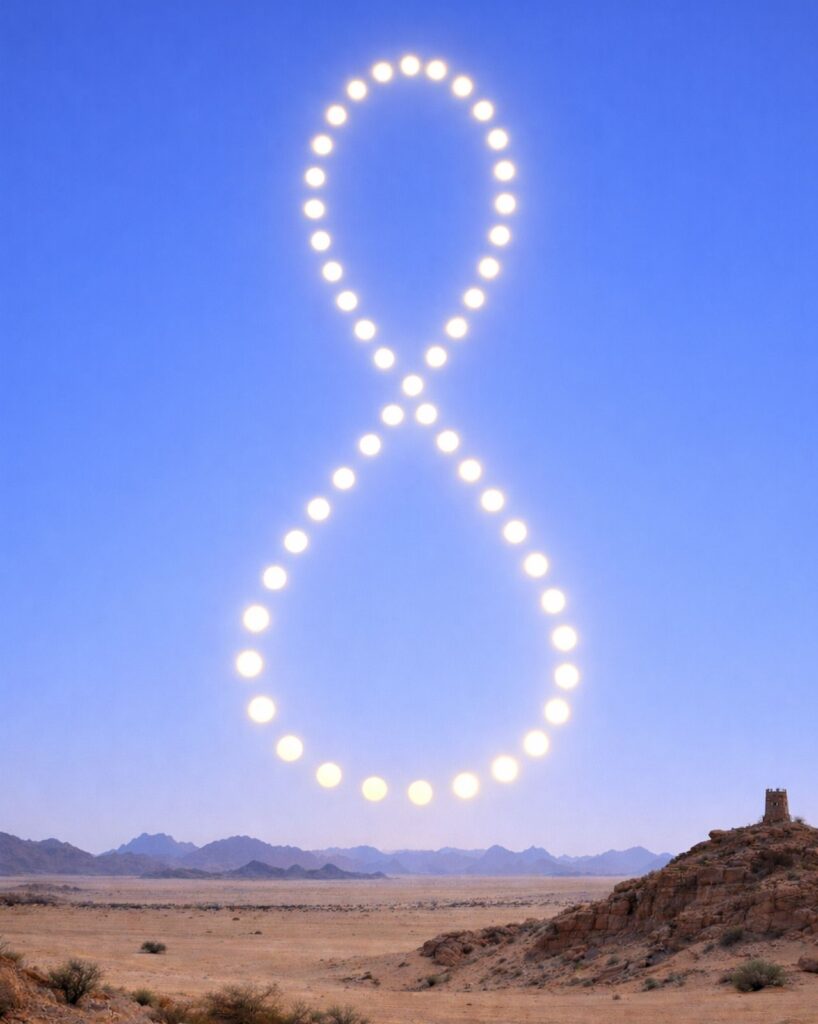🛑 الصورة المرفقة: محاكاة تمثل الشكل الظاهري للأناليما في السعودية عند تصوير الشمس يومياً في نفس التوقيت (الساعة 10 صباحاً) على مدار عام كامل بدءًا من 21 يناير 2026 حيث يمثل الرأس الأعلى الانقلاب الصيفي (أعلى ميل للشمس في السماء)، بينما يمثل الرأس السفلي الانقلاب الشتوي (أدنى ميل للشمس).