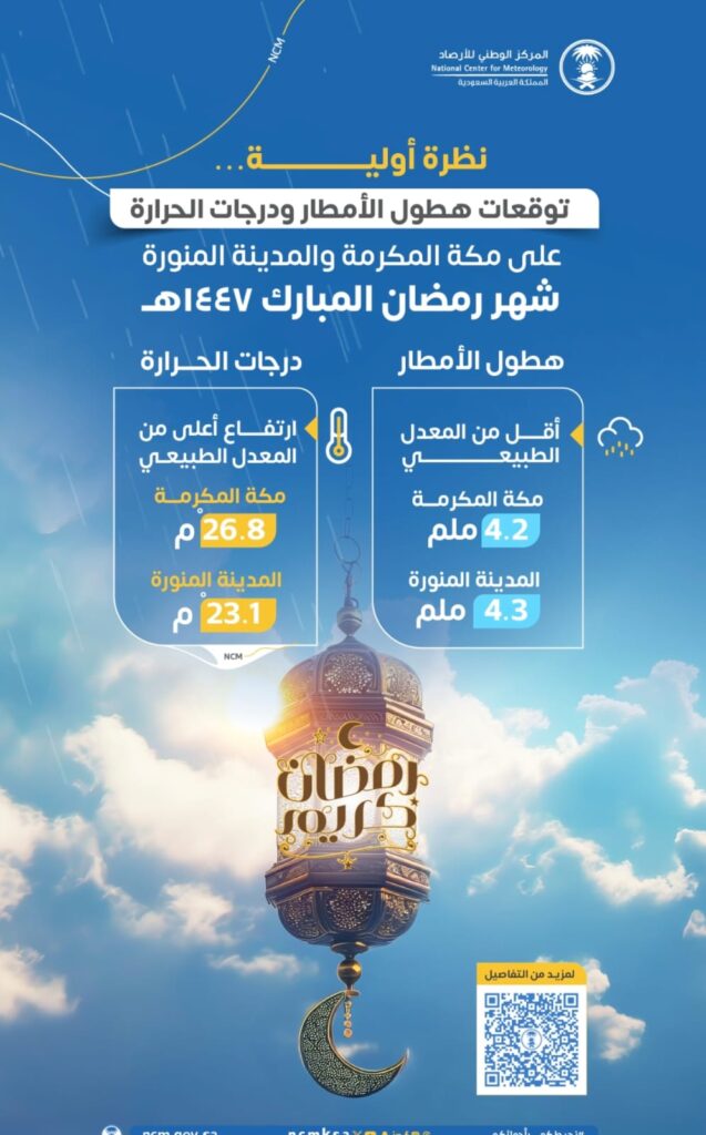 أصدر المركز الوطني للأرصاد النظرة الأولية للتوقعات المناخية لشهر رمضان المبارك لعام 1447هـ على منطقتي مكة المكرمة والمدينة المنورة، متضمنة هطول الأمطار ودرجات الحرارة خلال الشهر الفضيل.