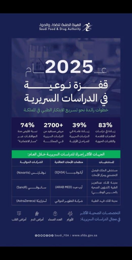 كما أظهرت إحصائيات الهيئة العامة للغذاء والدواء لعام 2025 تصدر نوفارتس بين الشركات متعددة الجنسيات من حيث المساهمة في التجارب السريرية بالمملكة، الأمر الذي يعكس تفاني الشركة في تقديم حلول علاجية مبتكرة وتعزيز البنية البحثية وفق أفضل الممارسات والمعايير الدولية.