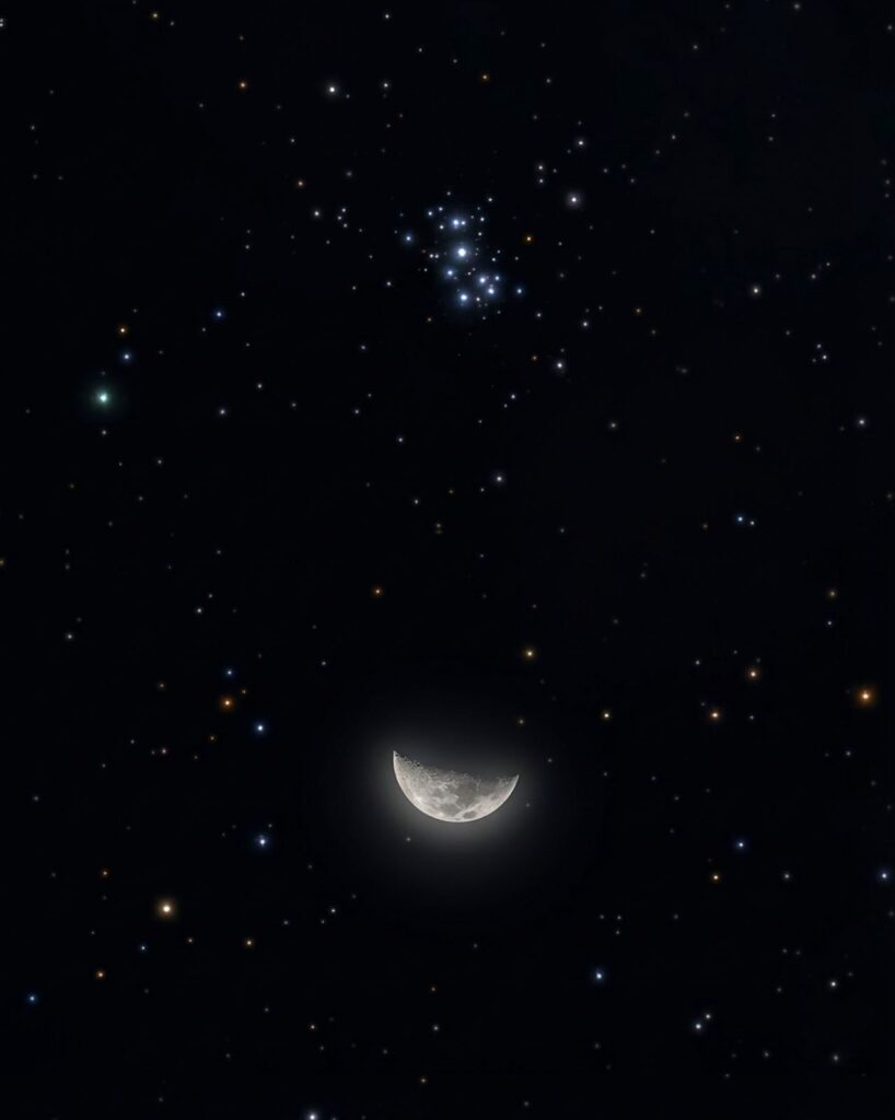 يظهر القمر في طوره المتزايد بينما يتموضع عنقود الثريا إلى جواره ما يمنح الراصدين فرصة رائعة للتأمل في جمال السماء الشتوية ويرى هذا الاقتران بعد غروب الشمس وبداية دخول الظلام.
