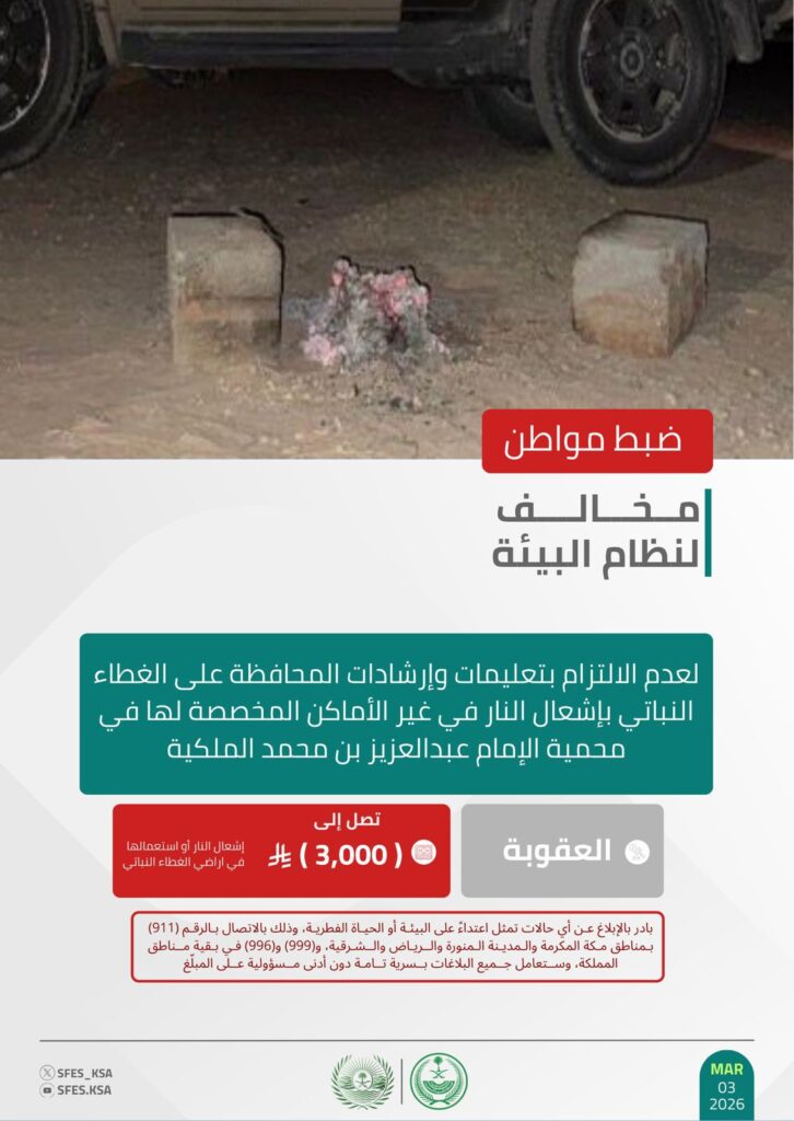 وأكدت أن عقوبة إشعال النار في غير الأماكن المخصصة لها في الغابات والمتنزهات الوطنية تصل إلى غرامة قدرها (3,000) ريال، داعيةً الجميع إلى الالتزام بالأنظمة والتعليمات.