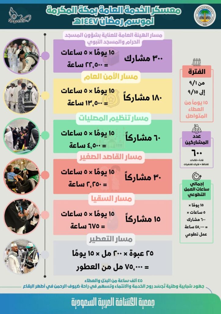 حقق الفتية والشباب والقادة الكشفيين والقائدات المشاركون في معسكر خدمة المعتمرين الذي تقيمه وتشرف عليه جمعية الكشافة العربية السعودية في الحرم المكي الشريف، أكثر من 45 ألف ساعة عمل تطوعية خلال النصف الأول من شهر رمضان المبارك، في إطار الجهود الوطنية لخدمة ضيوف الرحمن وتيسير أداء مناسكهم في أجواء من الطمأنينة والسكينة.