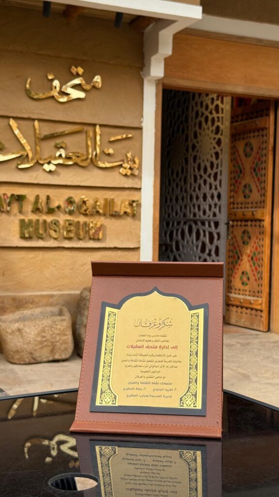 وأعربت مديرة المدرسة الأستاذة هبايب المطيري عن بالغ شكرها وتقديرها لإدارة بيت العقيلات على حفاوة الاستقبال والتعاون المثمر، مؤكدة أن الزيارة أسهمت في تعريف الطالبات بتاريخ المنطقة وإبراز الموروث الثقافي بأسلوب تعليمي تفاعلي ، كما قدّمت إدارة المدرسة درعًا تذكاريًا إهداءً إلى بيت العقيلات تقديرًا لجهودهم الثقافية ودورهم البارز في خدمة التعليم والمجتمع .