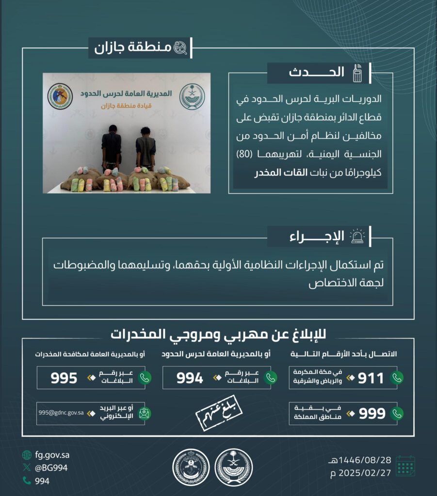 قبضت الدوريات البرية لحرس الحدود في قطاع الدائر بمنطقة جازان على مخالفين لنظام أمن الحدود من الجنسية اليمنية، لتهريبهما (80) كيلوجرامًا من نبات القات، وجرى استكمال الإجراءات النظامية الأولية بحقهما، وتسليمهما والمضبوطات لجهة الاختصاص.