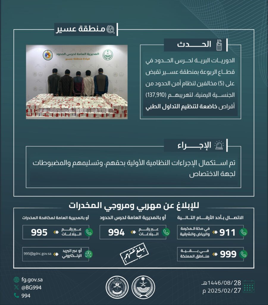 قبضت الدوريات البرية لحرس الحدود في قطاع الربوعة بمنطقة عسير على (5) مخالفين لنظام أمن الحدود من الجنسية اليمنية، لتهريبهم (137,910) أقراص خاضعة لتنظيم التداول الطبي، وجرى استكمال الإجراءات النظامية الأولية بحقهم، وتسليمهم والمضبوطات لجهة الاختصاص.