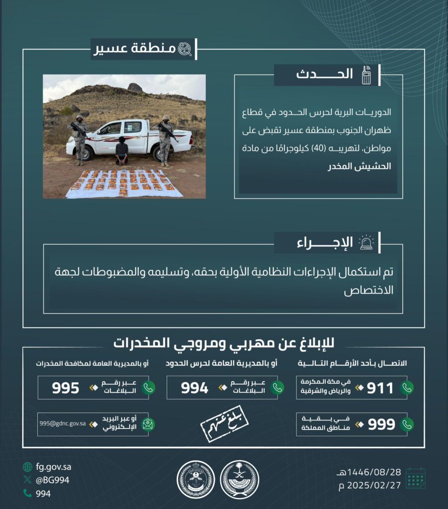 قبضت الدوريات البرية لحرس الحدود في قطاع ظهران الجنوب بمنطقة عسير على مواطن، لتهريبه (40) كيلوجرامًا من مادة الحشيش المخدر، وجرى استكمال الإجراءات النظامية الأولية بحقه، وتسليمه والمضبوطات لجهة الاختصاص.