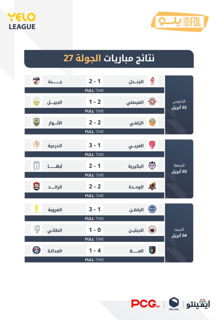 وحقق جدة فوزًا ثمينًا على مضيفه الجندل بنتيجة 2-1 رافعًا رصيده إلى 34 نقطة في المركز الـ 11 بينما توقف رصيد الجندل عند 26 نقطة في المركز الـ 14.