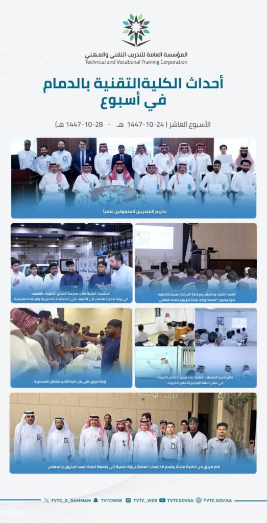 برعاية سعادة عميد الكلية التقنية بالدمام، أُقيم حفل تكريم المتدربين المتفوقين الحاصلين على مكافأة التفوق العلمي، تقديراً لتميّزهم الأكاديمي وإنجازاتهم اللافتة، وتحفيزاً لهم على مواصلة مسيرة التفوق والنجاح في حياتهم العلمية والعملية.