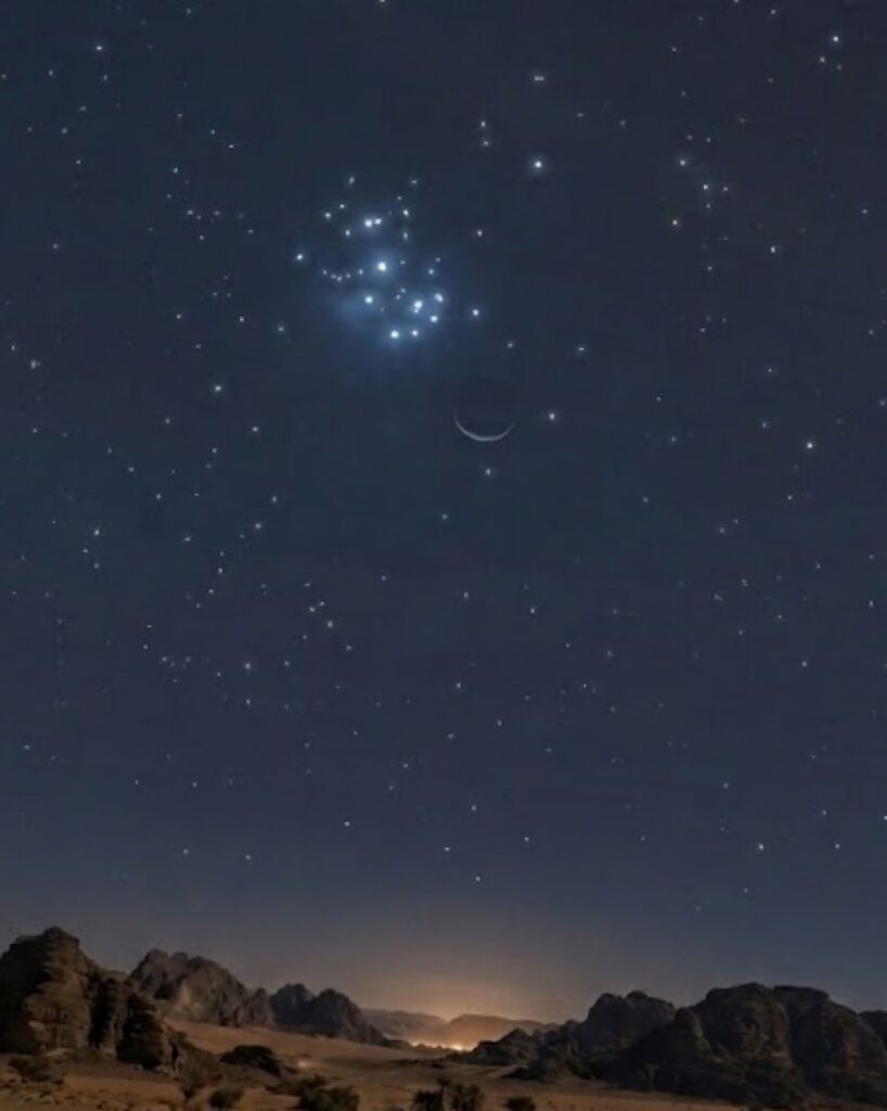 سيظهر هلال القمر الصغير المتزايد بعد أيام قليلة من المحاق في طوره الأول كخيط رفيع مضيء يشير إلى بداية الشهر القمري،L حيث يقترب بصرياً من عنقود الثريا المعروف أيضاً باسم “الشقيقات السبع” بمسافة زاوية قصيرة بينهما ما يجعلهما يظهران معاً في مجال رؤية المناظير أو عدسات التصوير ذات البعد البؤري المتوسط.