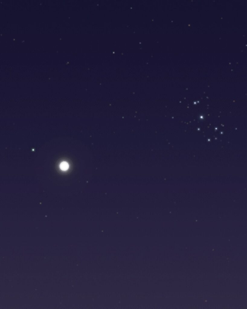 تشير التقديرات الفلكية إلى أن أورانوس سيكون قريباً من الزهرة بفاصل زاوي يقارب درجة واحدة مساء 23 أبريل مع اختلاف طفيف حسب الموقع الجغرافي بينما يظهر عنقود الثريا على بعد يقارب 3 إلى 4 درجات ما يجعل رصد الأجرام الثلاثة معاً في مجال رؤية واحد ممكناً باستخدام المناظير، ويبدأ أفضل وقت للمشاهدة بعد نحو 75 إلى 90 دقيقة من غروب الشمس باتجاه الأفق الغربي إلى الشمال الغربي حيث يكون التجمع منخفضاً فوق الأفق بارتفاع يقارب 10 إلى 15 درجة تقريباً تبعاً لموقع الراصد.
