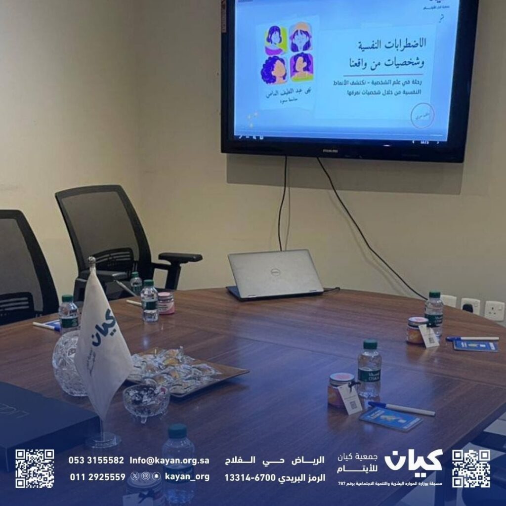 نظّم القسم النفسي بجمعية كيان للأيتام ذوي الظروف الخاصة محاضرة بعنوان «الاضطرابات النفسية وشخصيات من الواقع»، قدّمتها طالبة التدريب نهى الماص من جامعة الملك سعود (تخصص علم النفس)، بحضور المدير التنفيذي الأستاذة ندى القنيبط ومنسوبات الجمعية، وبإشراف الأخصائية ريم البليخي.