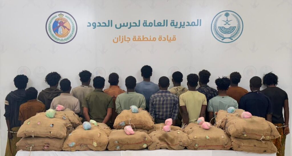 قبضت الدوريات البرية لحرس الحدود في قطاع الدائر بمنطقة جازان على (17) مخالفاً لنظام أمن الحدود من الجنسية الإثيوبية، لتهريبهم (340) كيلوجراماً من نبات القات المخدر، وجرى استكمال الإجراءات النظامية الأولية بحقهم، وتسليمهم والمضبوطات لجهة الاختصاص.
