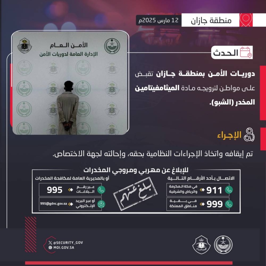 قبضت دوريات الأمن بمنطقة جازان على مواطن لترويجه مادة الميثامفيتامين المخدر (الشبو)، وجرى إيقافه واتخاذ الإجراءات النظامية بحقه، وإحالته لجهة الاختصاص.