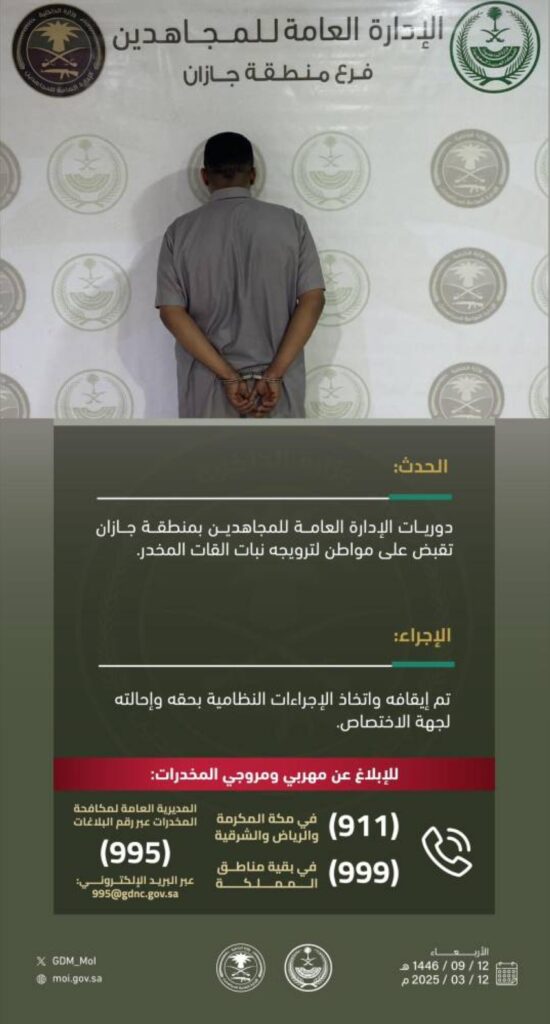 قبضت دوريات الإدارة العامة للمجاهدين بمنطقة جازان على مواطن لترويجه نبات القات المخدر، وأوقف واتخذت الإجراءات النظامية بحقه، وأحيل إلى جهة الاختصاص.
