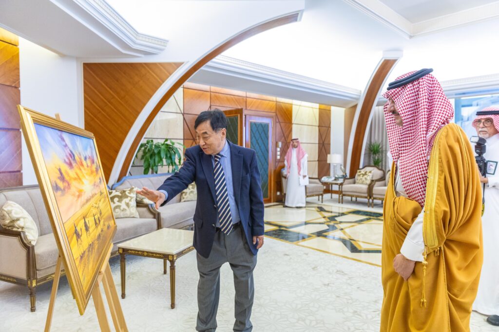 وفي ختام اللقاء، قدم رئيس المجلس هدية لسموه عبارة عن لوحة فنية من أعمال الرسام الكوري (سيونج باكيم) الذي يقيم في المملكة منذ 40 عاماً.