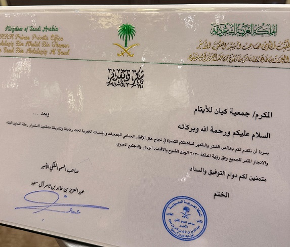 هذا وتم تكريم جمعية كيان بشهادة “شكر وتقدير” لتلبيتهم الدعوة ومشاركة سموه الكريم طعام الإفطار الجماعي، وقد ثمنت جمعية كيان دعوة سموه الكريمة وشكرته على مشاركته أبناءه الأيتام في إفطارهم الرمضاني، والالتقاء بهم والتعرف عليهم. سائلًين الله تبارك وتعالى أن يجعل ذلك في موازين حسناته.