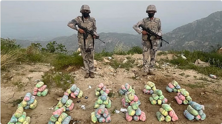 كما قبضت الدوريات البرية لحرس الحدود في قطاع الربوعة بمنطقة عسير على مخالفين لنظام أمن الحدود من الجنسية الإثيوبية، لتهريبهما (48) كيلوجرامًا من مادة الحشيش المخدر، وجرى استكمال الإجراءات النظامية الأولية بحقهما، وتسليمهما والمضبوطات لجهة الاختصاص.