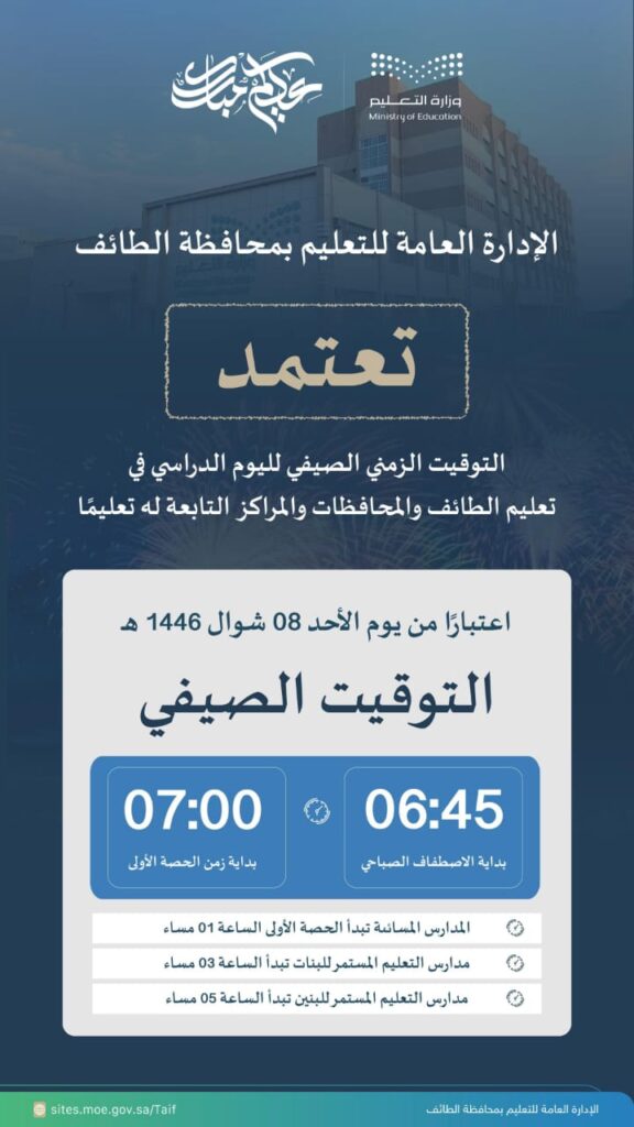 وأوضح المدير العام للتعليم بالطائف الدكتور سعيد بن عبدالله الغامدي: أن موعد تطبيق الدوام الصيفي للمدارس بالطائف والمحافظات والمراكز التابعة لها تعليميًّا بكافة المراحل للبنين والبنات؛ سيكون اعتبارًا من يوم الأحد 08 شوال 1446هـ ، وسيكون الاصطفاف الصباحي الساعة “6:45” صباحًا، وبداية الحصة الأولى الساعة “7:00” صباحًا، والمدارس المسائية تبدأ الحصة الأولى الساعة “01:00” مساءً، وفي مدارس التعليم المستمرّ للبنات الساعة “03:00” مساءً، ومدارس التعليم المستمرّ للبنين الساعة “05:00” مساءً.