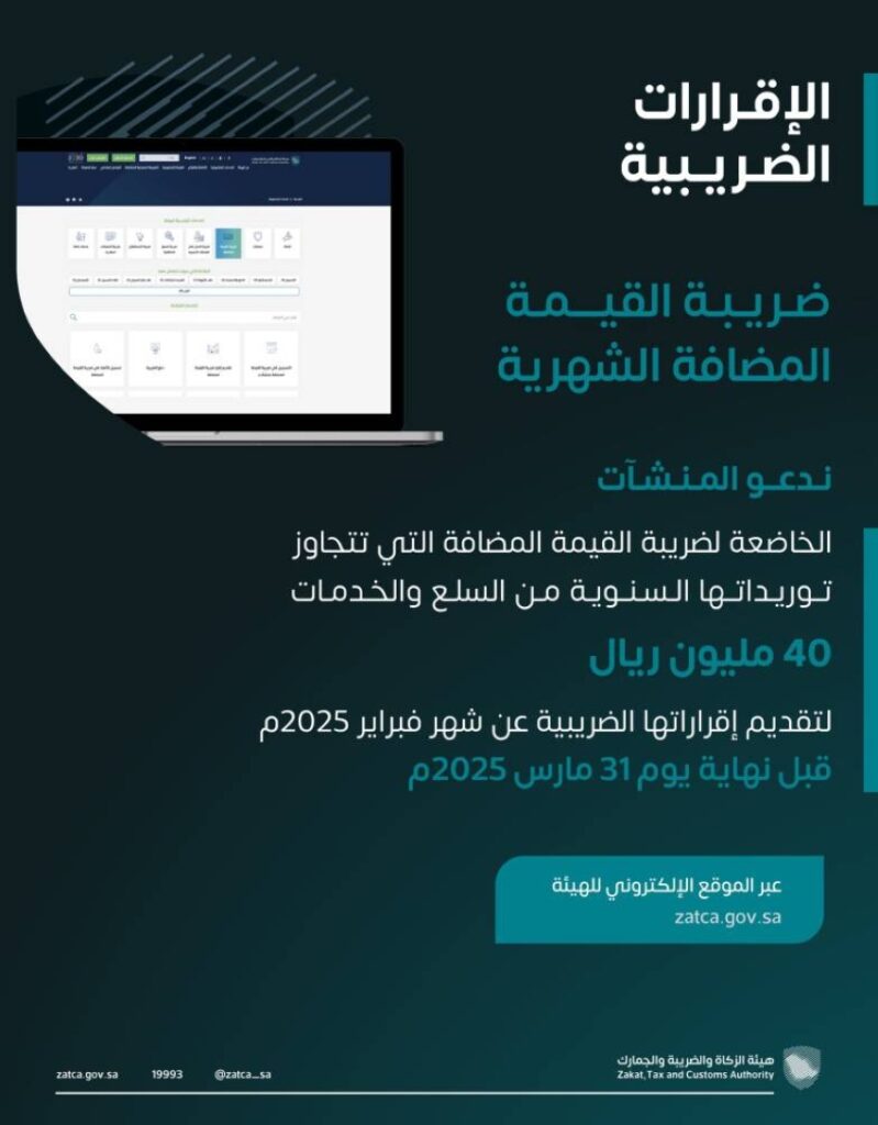 دعت هيئة “الزكاة والضريبة والجمارك” المنشآت من قطاع الأعمال الخاضعين لضريبة القيمة المضافة التي تتجاوز توريداتها السنوية من السلع والخدمات 40 مليون ريال إلى تقديم إقراراتها الضريبية عن شهر فبراير 2025م، في موعدٍ أقصاه 31 من شهر مارس 2025م.